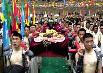 人們穿上節(jié)日盛裝,群聚在為佛教大師而誦祈愿經(jīng)的寺院前,高誦“六字真經(jīng)”,向怫的神靈祈愿、磕頭,各村寨的男人們騎上馬,帶上早已備好的柏香樹枝,到村旁的神塔前,高誦禱詞,舉行盛大的煨桑儀式,并向天空拋撒印有獅、虎、龍、鵬的“龍達”(風(fēng)馬)。男女青年跳起鍋莊舞,老人們坐在看臺上邊喝酒、聊天。還有能說善唱的藝人說唱藏族民間長詩、格薩爾王傳等,直至圓月升起,人們才扶老攜幼,高唱誦念“六字真經(jīng)”愉快地回家。