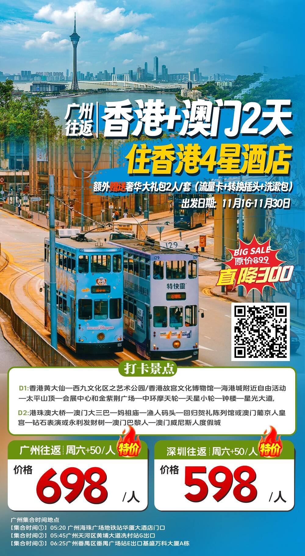 11月香港+澳門2天 住香港4星酒店原價898直降300
