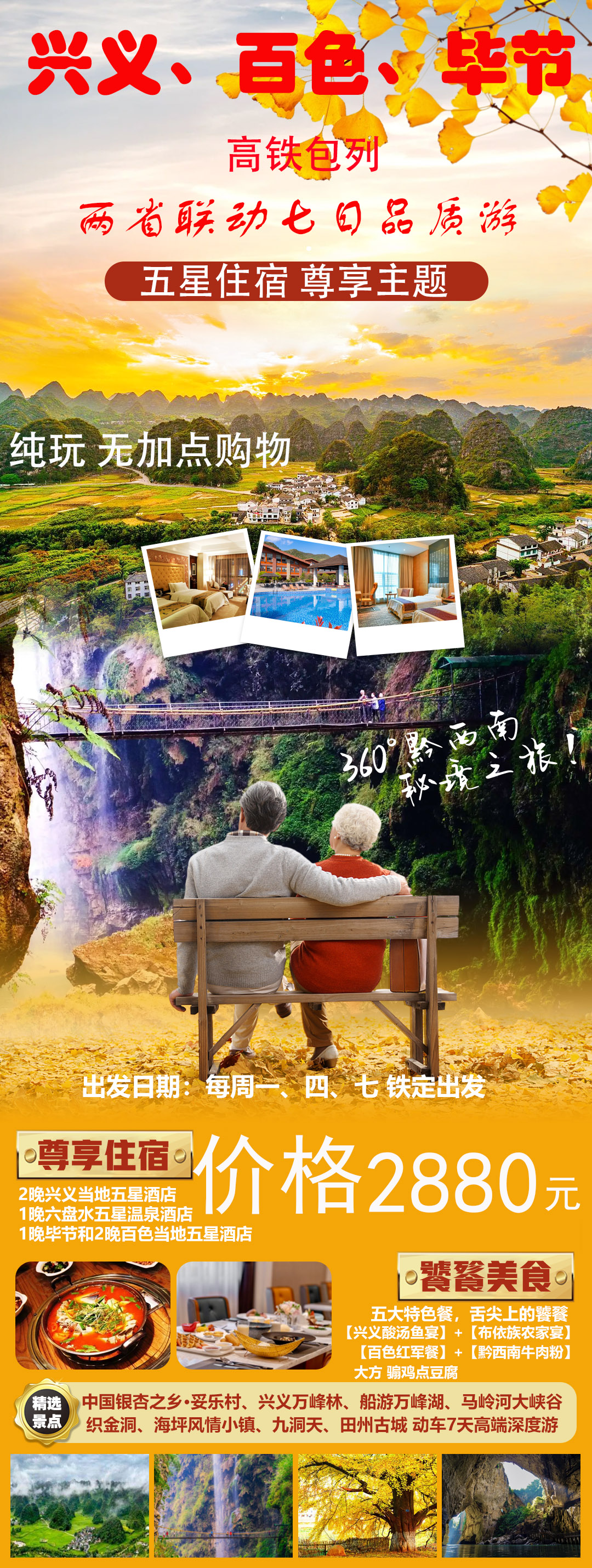 精選中國銀杏之鄉(xiāng)·妥樂村、興義萬峰林、船游萬峰湖、馬嶺河大峽谷景點織金洞、海坪風情小鎮(zhèn)、九洞天、田州古城 動車7天高端深度游